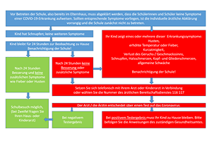 Vor Betreten der Schule, also bereits im Elternhaus, muss abgeklärt sein, dass die Schülerinnen und Schüler keine Symptome einer COVID-19-Erkrankung aufweisen. Sollten entsprechende Symptome vorliegen, ist eine individuelle ärztliche Abklärung vorrangig und die Schule zunächst nicht zu betreten.